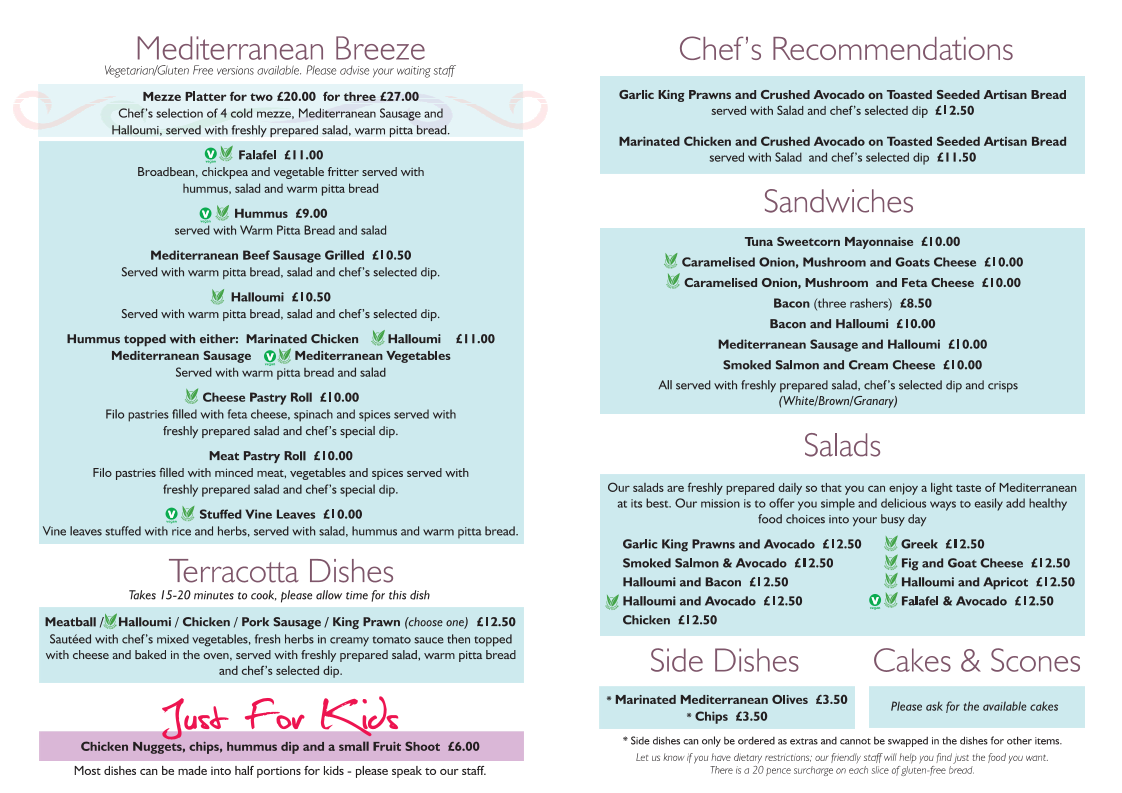 For younger diners, the Just For Kids menu includes kid-friendly choices like Chicken Nuggets, Chips, and Hummus Dip with a Small Fruit Shoot, ensuring that even the little ones can enjoy a meal here.