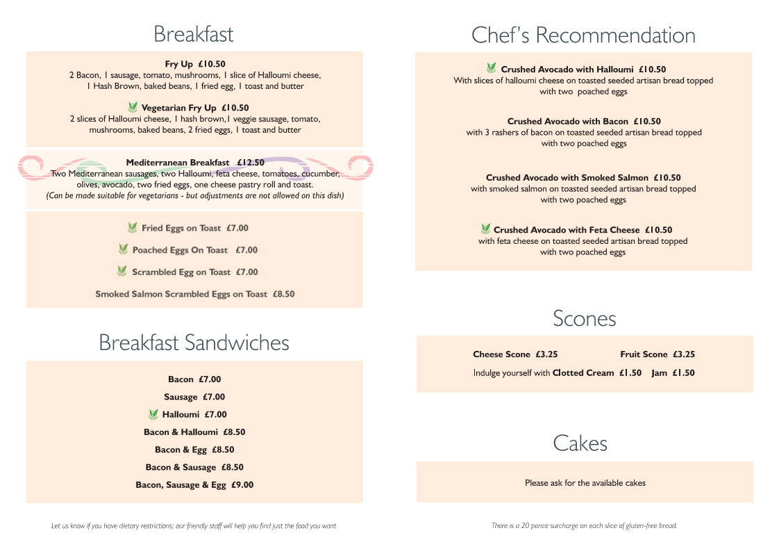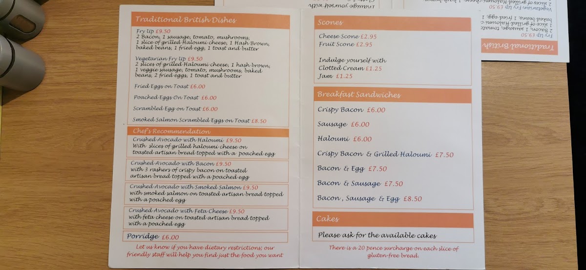 If you're in the mood for something portable, the Breakfast Sandwiches menu is full of tasty options like Bacon, Sausage, Halloumi, and combinations such as Bacon & Halloumi or Bacon & Egg. For those with a sweet tooth, the Scones section includes both savory and fruity choices, like the Cheese Scone and Fruit Scone with Jam.